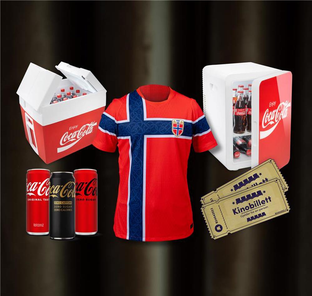 🥇 1. premie deles ut til 5 vinnere og inkluderer Norge-drakt, mini kjøleskap fra Coca-Cola, kjølebag, kinobilletter og et brett med brus.