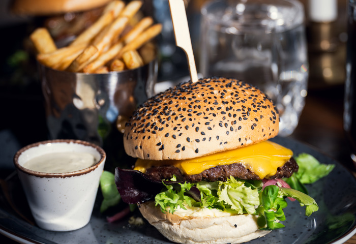 Saftig 100% Wagyuburger med smeltet cheddar, majones, frisk salat, syltet rødløk og sprø fritert løk. Serveres med kremet hvitløksdressing.