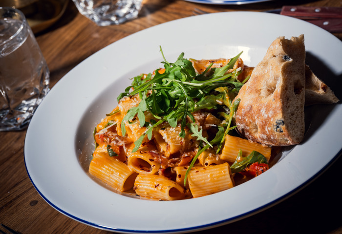 Rigatoni i en kremet tomatsaus med bacon, bakt paprika og litt chili. Toppet med parmesan, ruccula og et dryss chiliflak, og sprø parmesanchips på toppen for ekstra god smak.