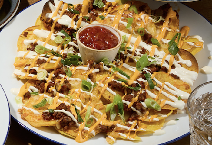 Sprø nachos med tacokjøtt, toppet med srirachamayo, frisk vårløk, rømme og chunky salsa.
