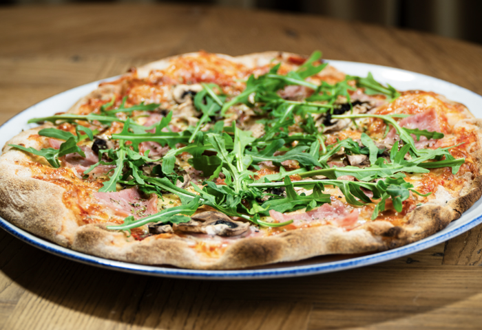 Pizza med smeltet ost, skinke, sjampinjong og frisk ruccula på toppen.
