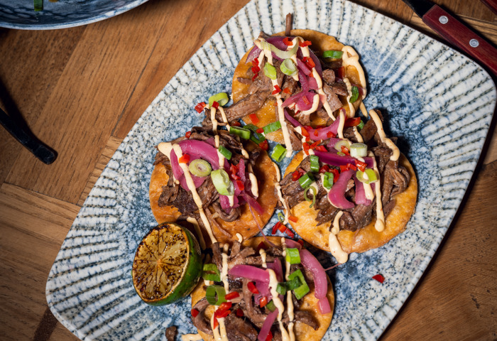 4 stk toppet med revet oksebrisket, syltet rødløk, vårløk og chili. Srirachamayo og grillet lime.