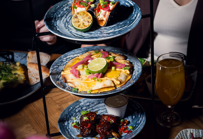 Et tårn fullt av smaker! Buffalo wings, sprø tostadas med hummersalat og små, smakfulle mini quesadillas